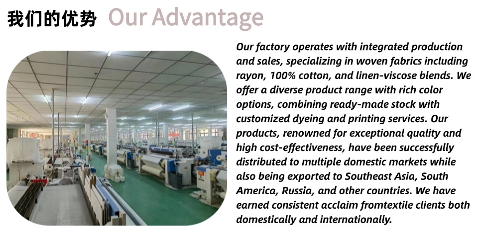 我们成立于2010年,总部坐落于中国纺织业重镇——浙江绍兴。作为专业坯布生产商,我们拥有5000平方米现代化厂房,配备100余台先进喷气织布机,并于近年通过新疆生产基地的扩建实现产能升级。旗下子公司绍兴黎昕纺织品有限公司自2016年起专注成品面料开发,形成完整的纺织产业链布局。1. 核心优势:生产实力主厂专注人棉/全棉坯布生产,年产能达8000万米新疆基地配备智能化生产线,实现规模化供应合作大企业印染工厂,配备数码印花等先进设备2.产品矩阵坯布系列:人棉坯布(30S-60S)、全棉坯布(40S-120S)成品面料:染色/印花人棉(常规60g-120g)、染色棉布(府绸/纱卡等)特色开发:麻粘、后工艺绣花面料3.服务体系 现货库存:常备200+人棉/全棉染色现货品种 柔性供应:印花订单500米起订,48小时快速打样 物流支持:保税仓备货,支持FOB/CIF多种贸易方式